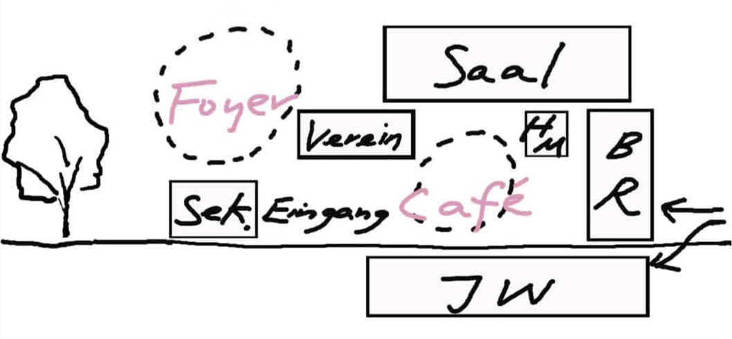 Vom Café aus ergeben sich Einblicke in den im ersten Stockliegenden Bereich der Vereinsräume. Diese wiederum sind mit einem weiteren zweigeschossigen Bereich im Anbau mit dem neuen Foyer verbunden. So entsteht eine Abfolge heller, einladender Räume, die vom Vorplatz über die Terrasse, das Café und dem zweigeschossige Foyer in den Saal führt.