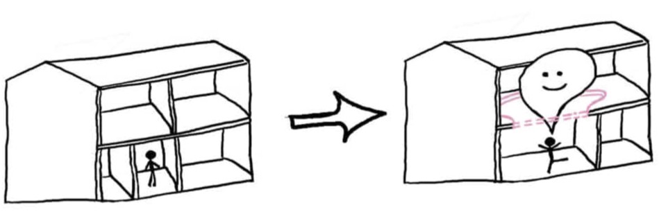 Umhüllt wird das ganze Pfarrheim von einer neuen Fassade. Die grossen, lichtspendenden Fenster mit breiten Rahmen und integriertem Sonnenschutz liegen über dem Raster des bestehenden Baus und verleihen dem Pfarreiheim ein freundliches Gesicht. Die neuen, freundlich gefärbten Böden und Vorhänge transportieren das vielfältige Leben im Haus nach aussen und beleben die Fassade.